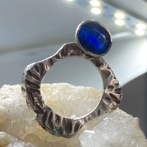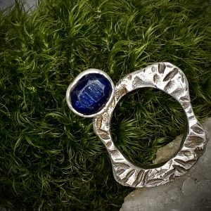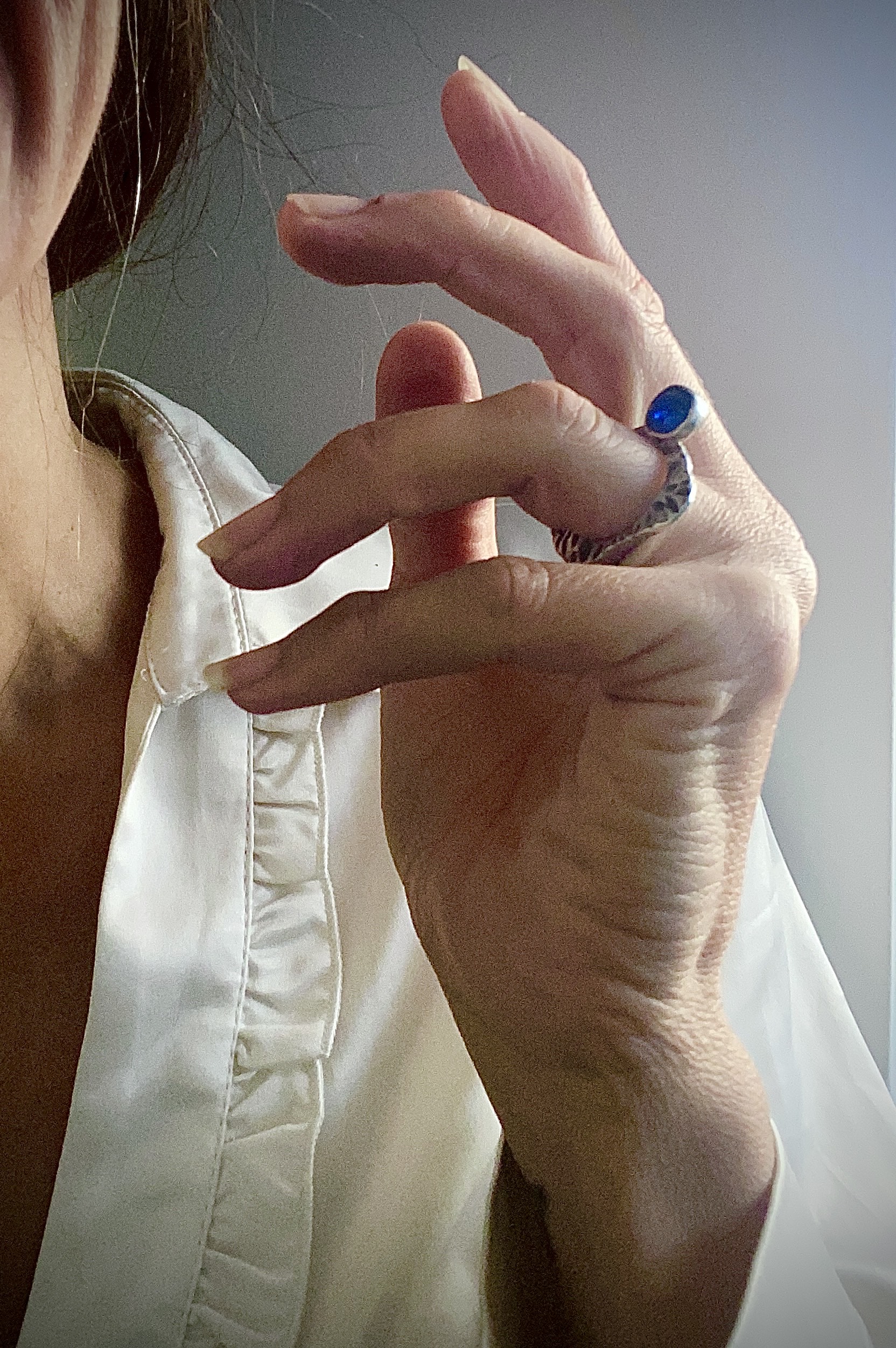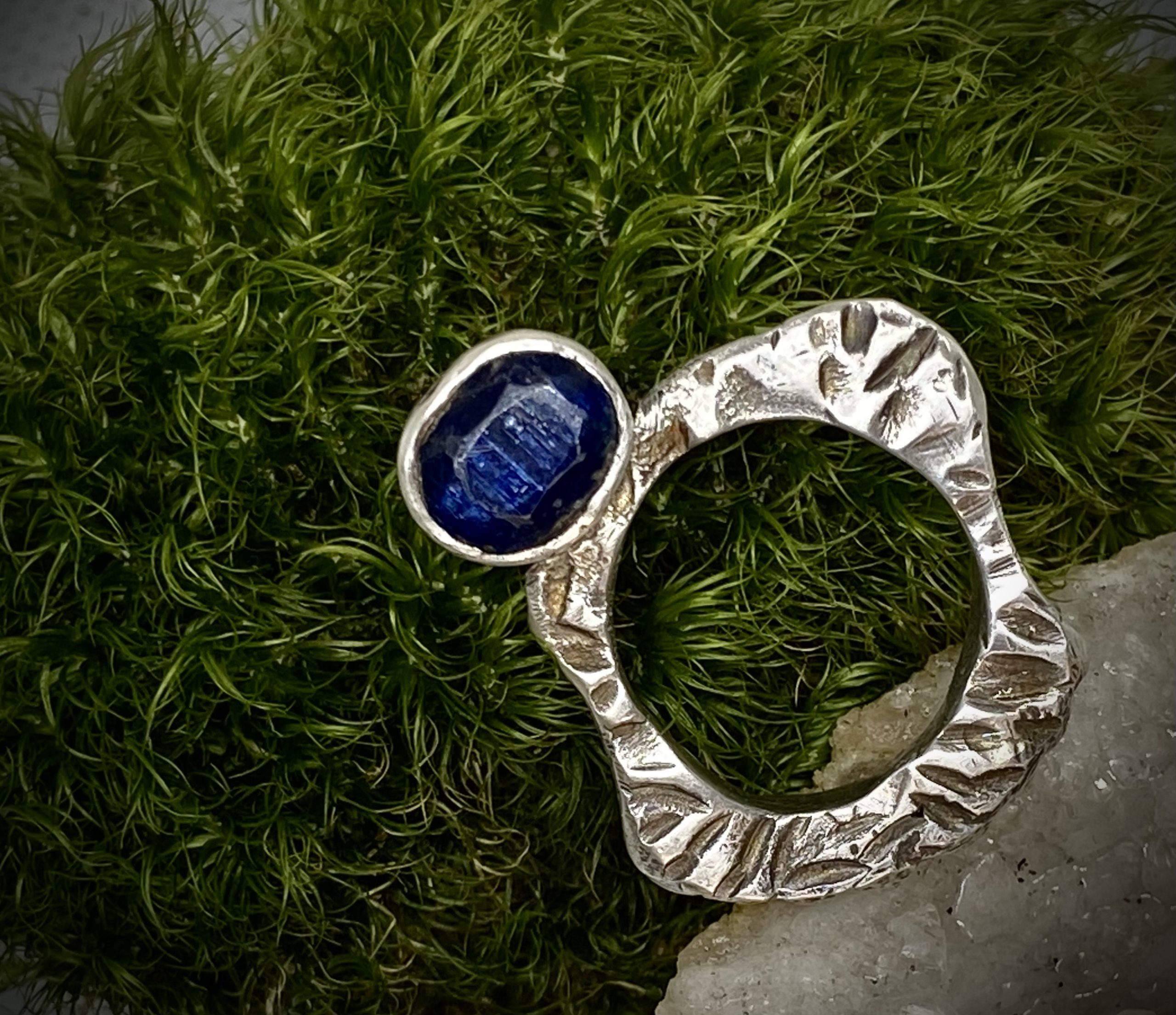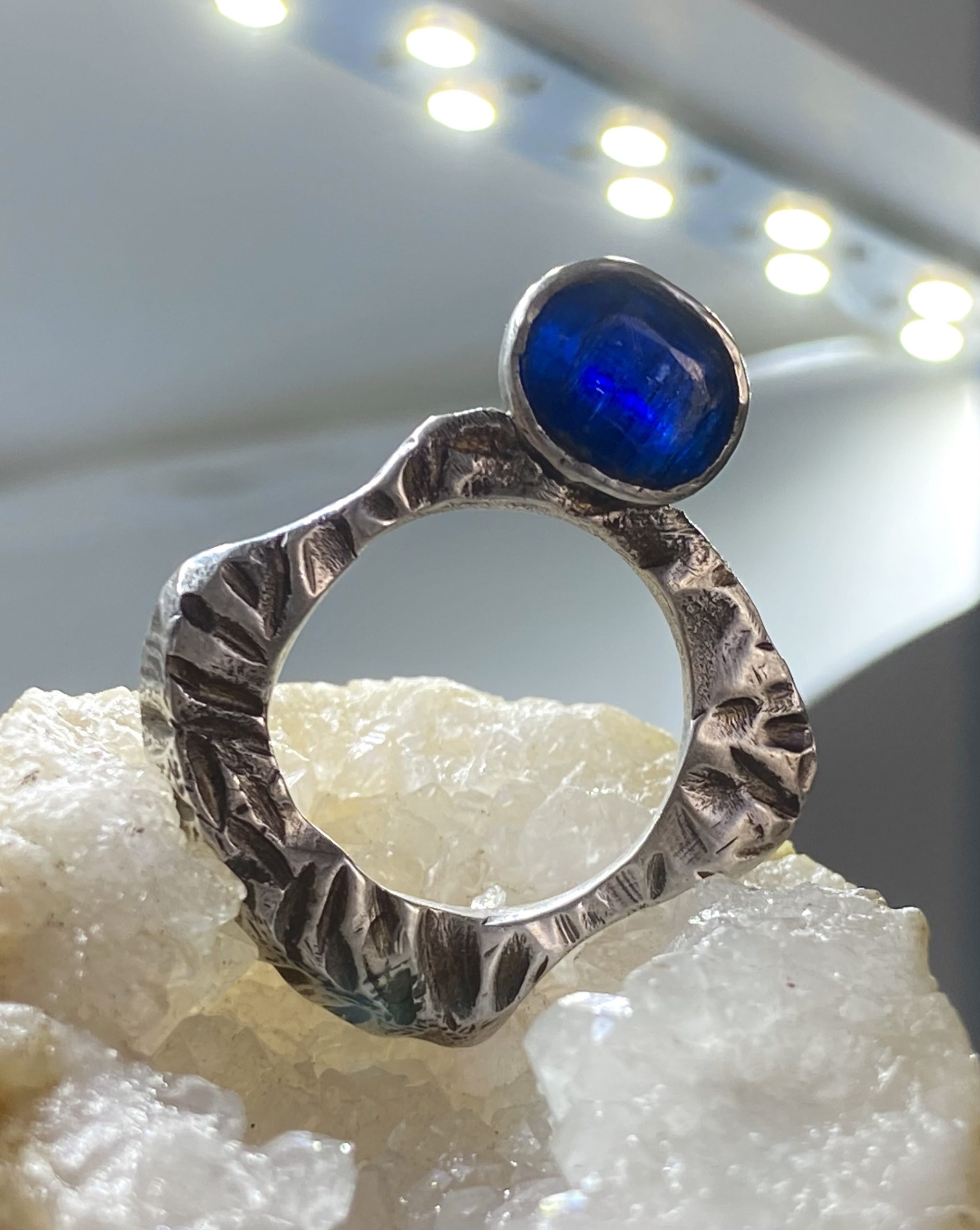 Prstan iz srebra 925 in kianita sem oblikovala kot opomnik na notranji mir – da ga nosimo vedno s seboj, kot svetlobo, ki nas drži pokonci.