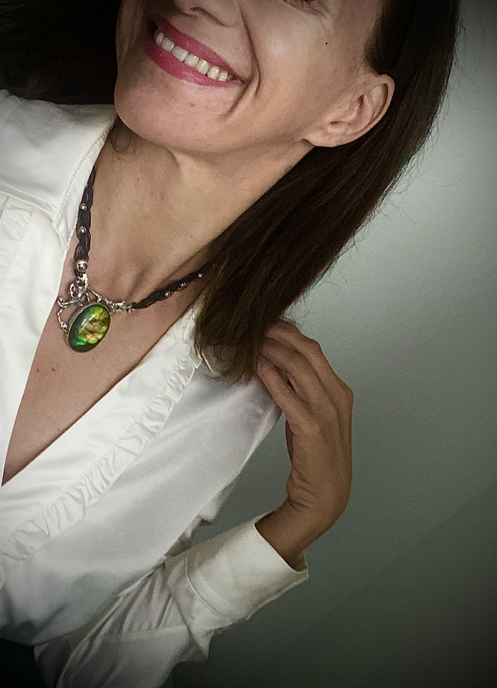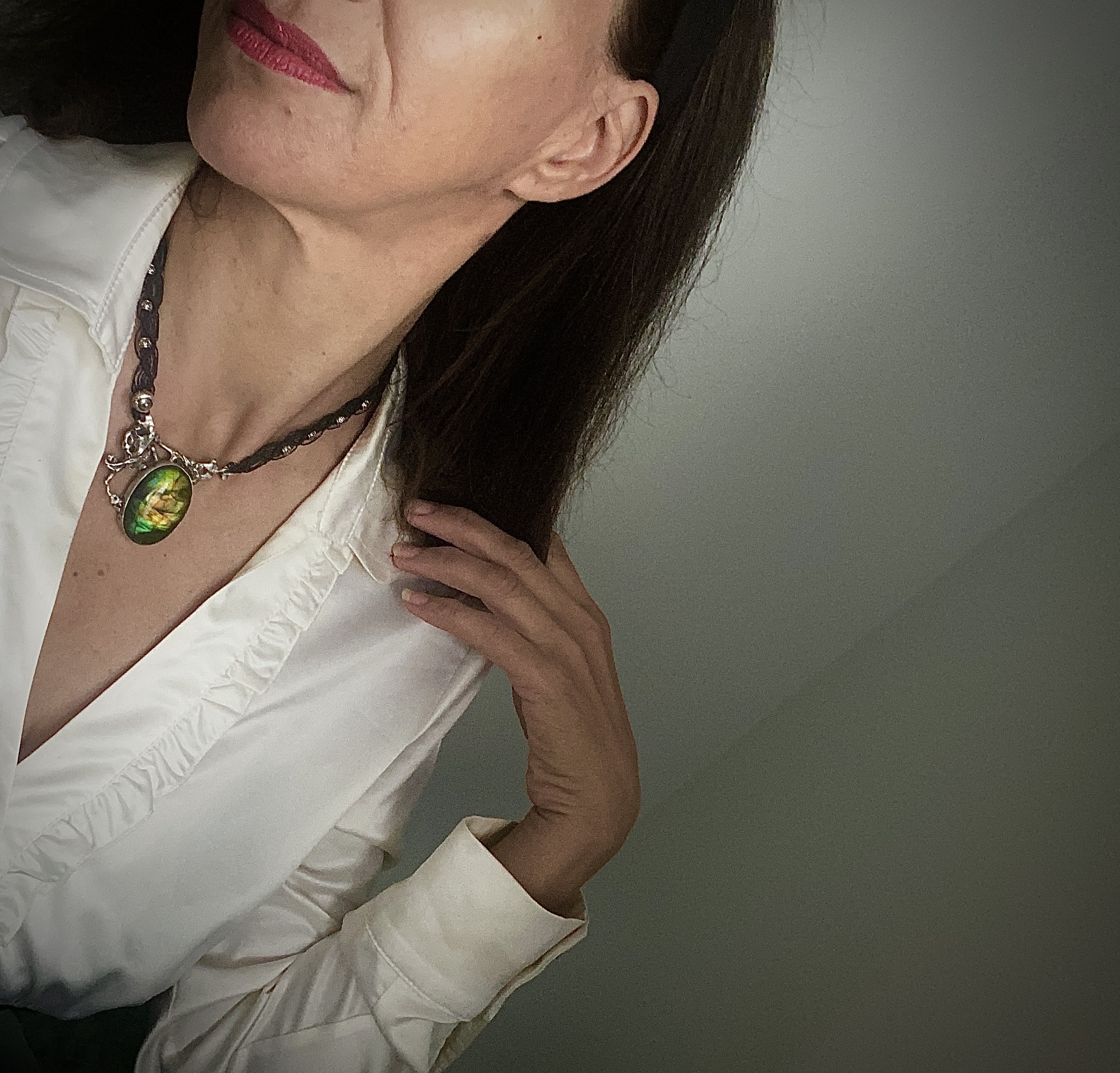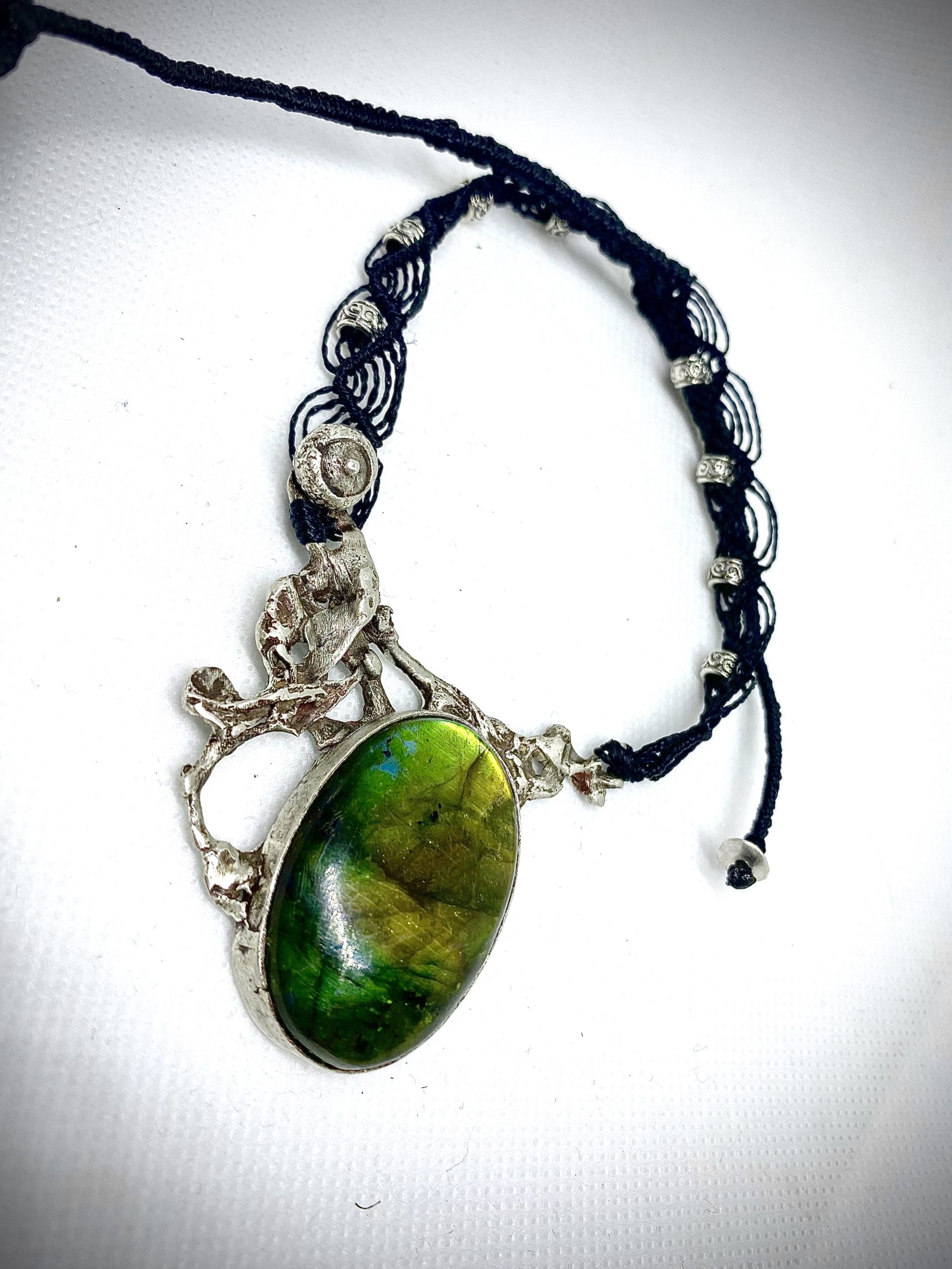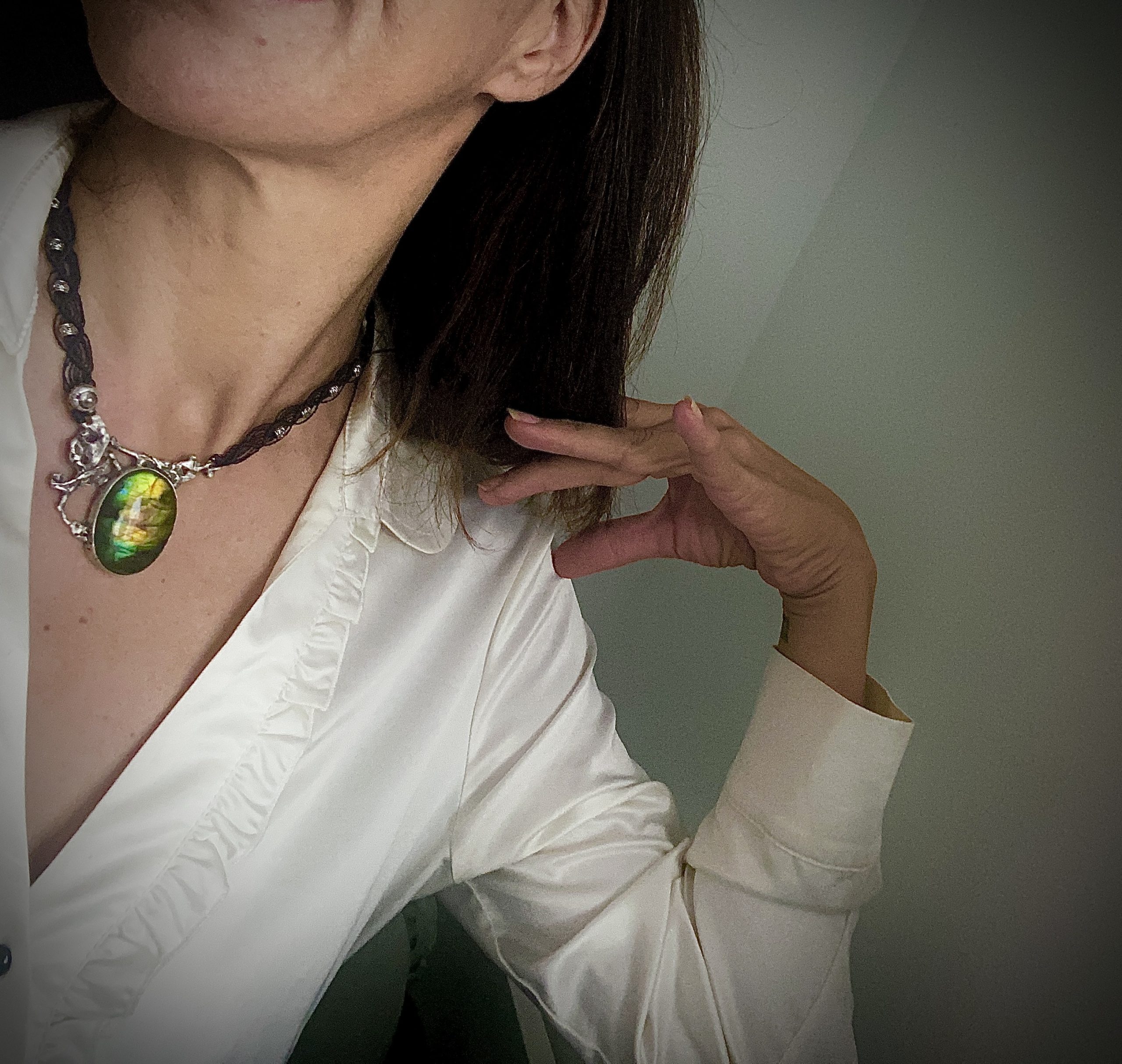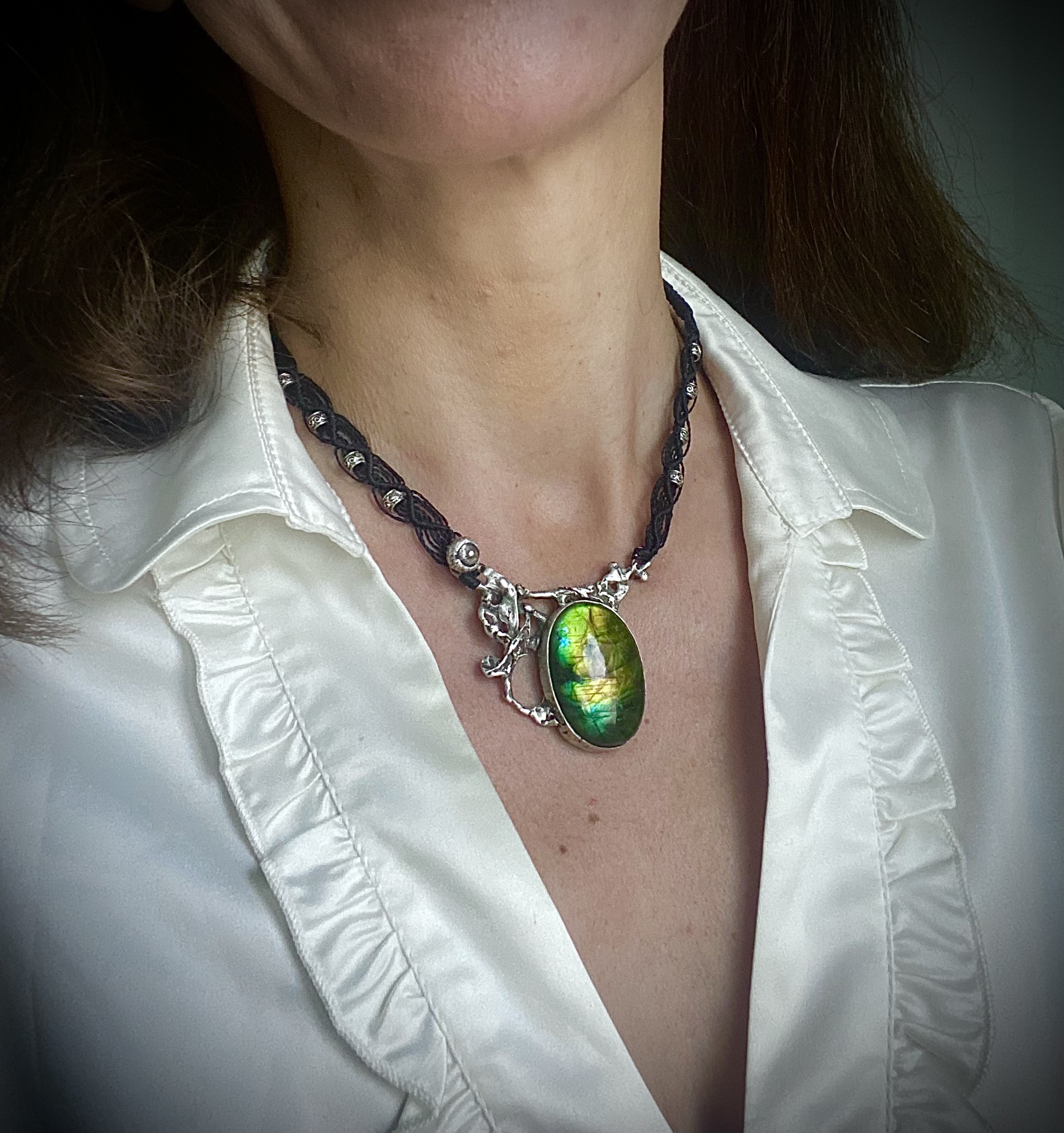 Ročno izdelana ogrlica iz srebra 925 z naravnim labradoritom, kamnom svetlobe, ki razkriva svoje barve le pod pravim kotom. Zeleni in zlatni odsevi se prelijejo kot svetlobna igra v naravi, kot da bi bil v njem ujet trenutek sončnega zahoda.