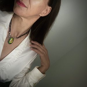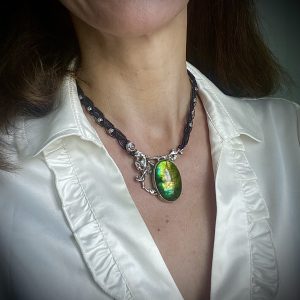 Srebrni okvir, oblikovan v organski, skoraj koralni strukturi, poudari naravno surovost in hkrati nežnost kamna. Črna ročno spletena vrvica s srebrnimi poudarki doda eleganco in ravnotežje.