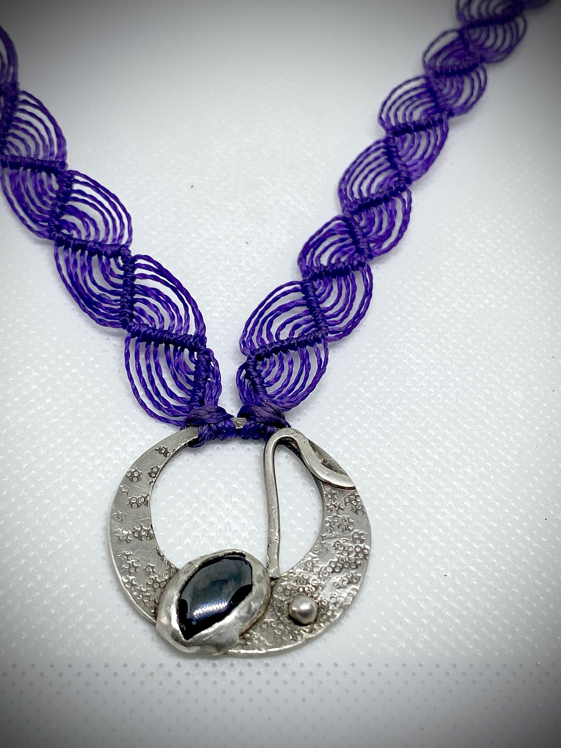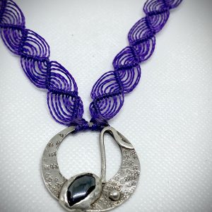 Srebrni okvir, oblikovan v organski, skoraj koralni strukturi, poudari naravno surovost in hkrati nežnost kamna. Črna ročno spletena vrvica s srebrnimi poudarki doda eleganco in ravnotežje.