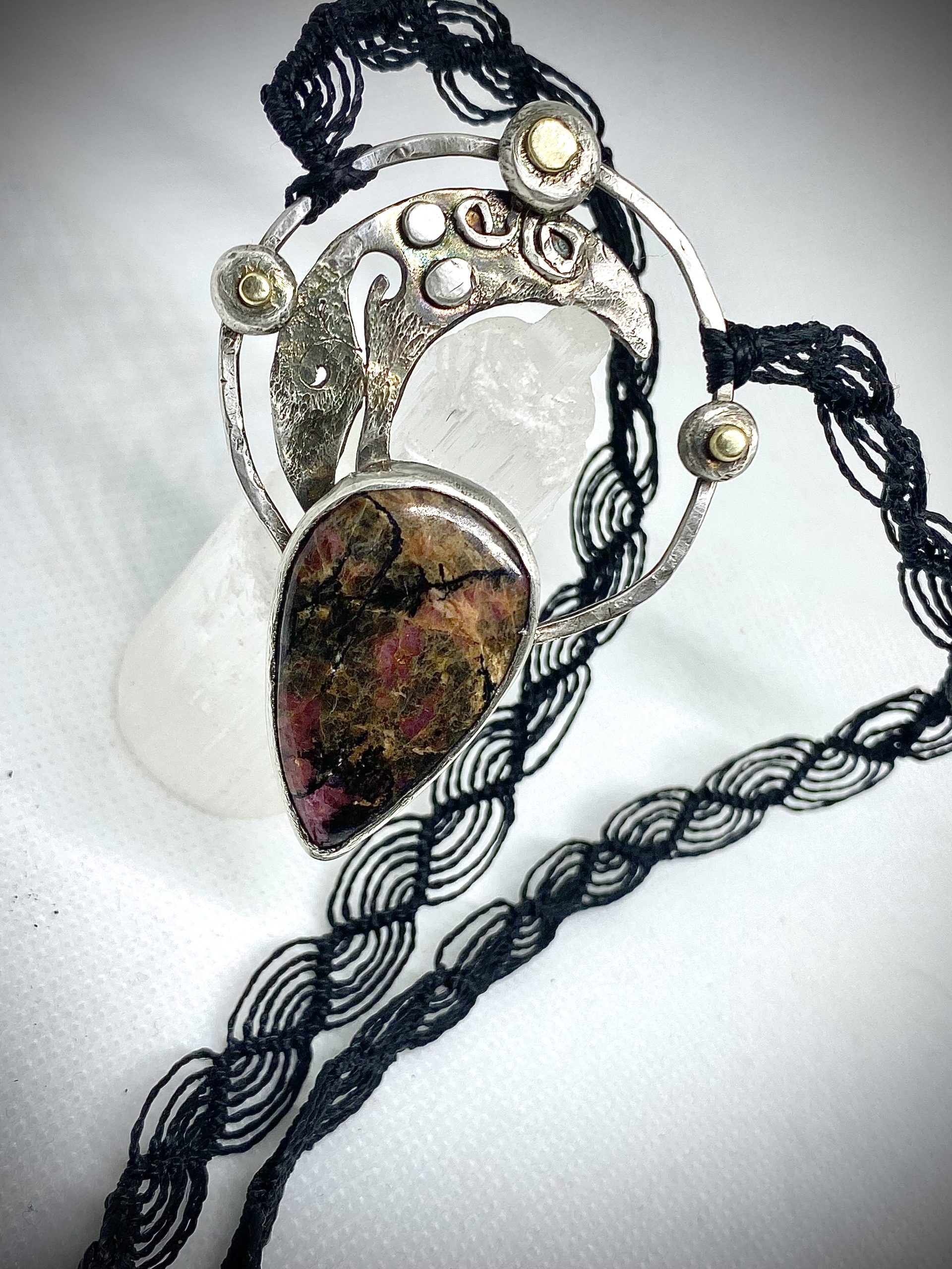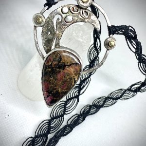 Materiali: 925 srebro, 14k zlato, naravni kamen (rhodonit / unakite), voskana vrvica