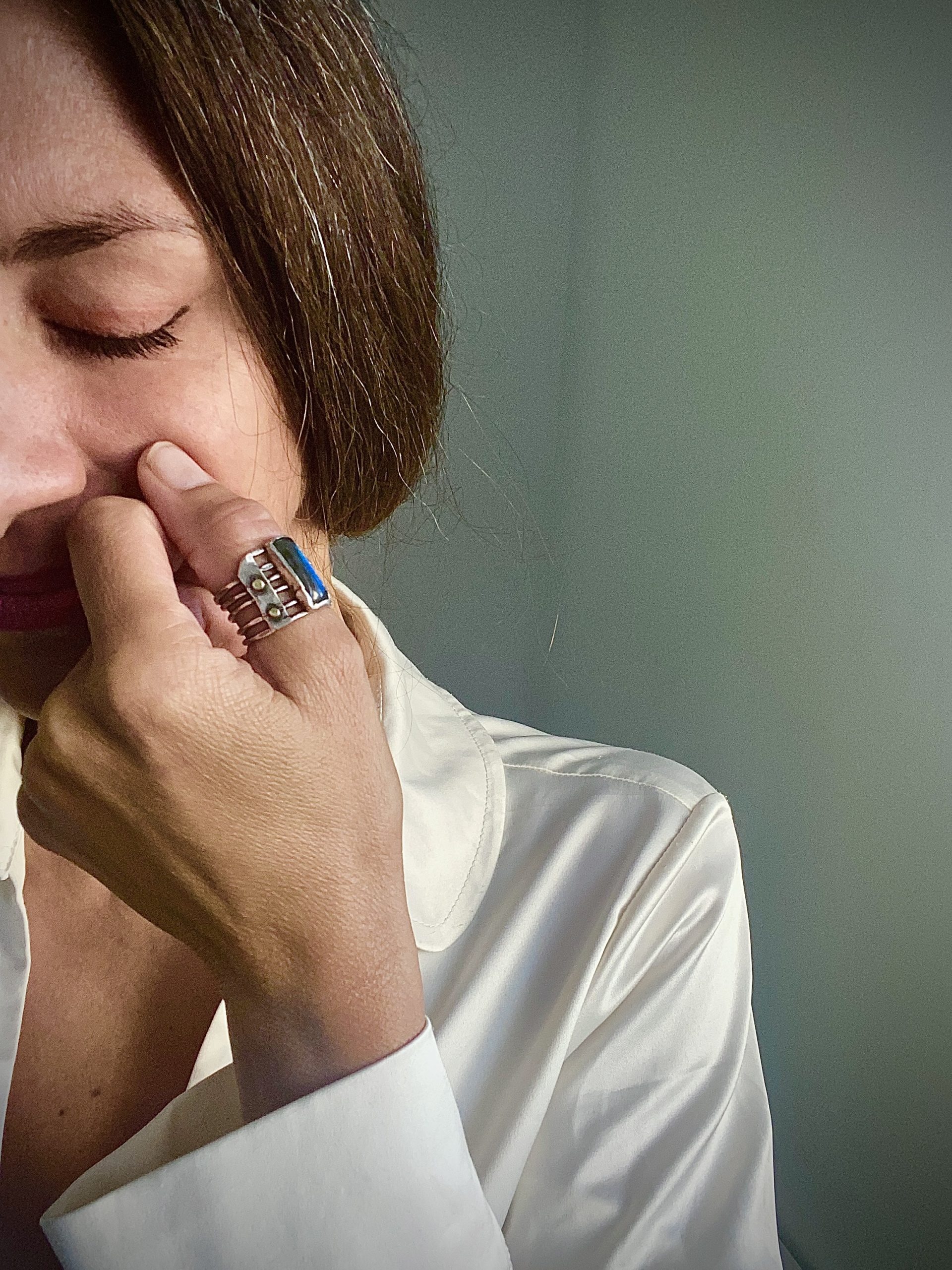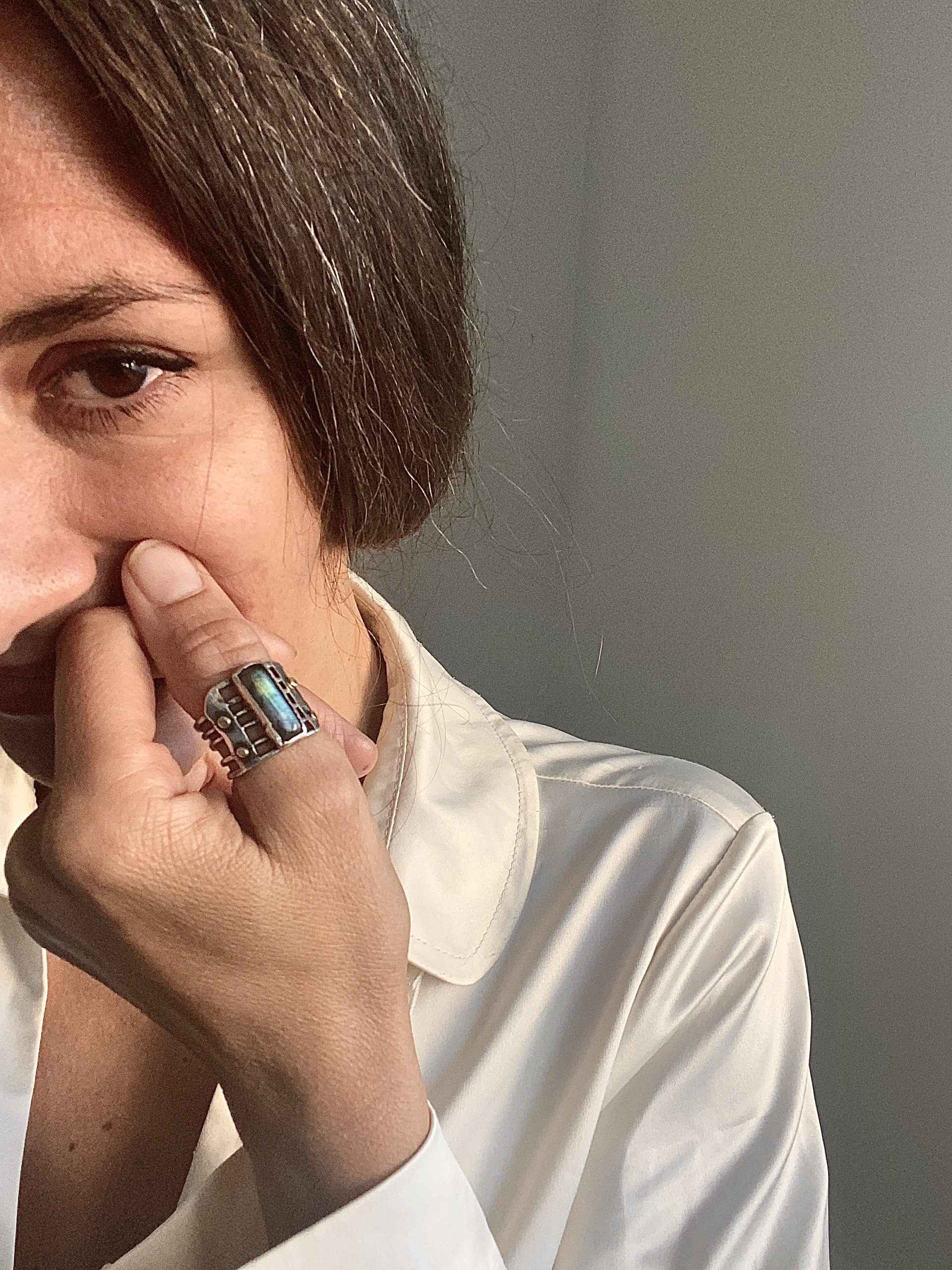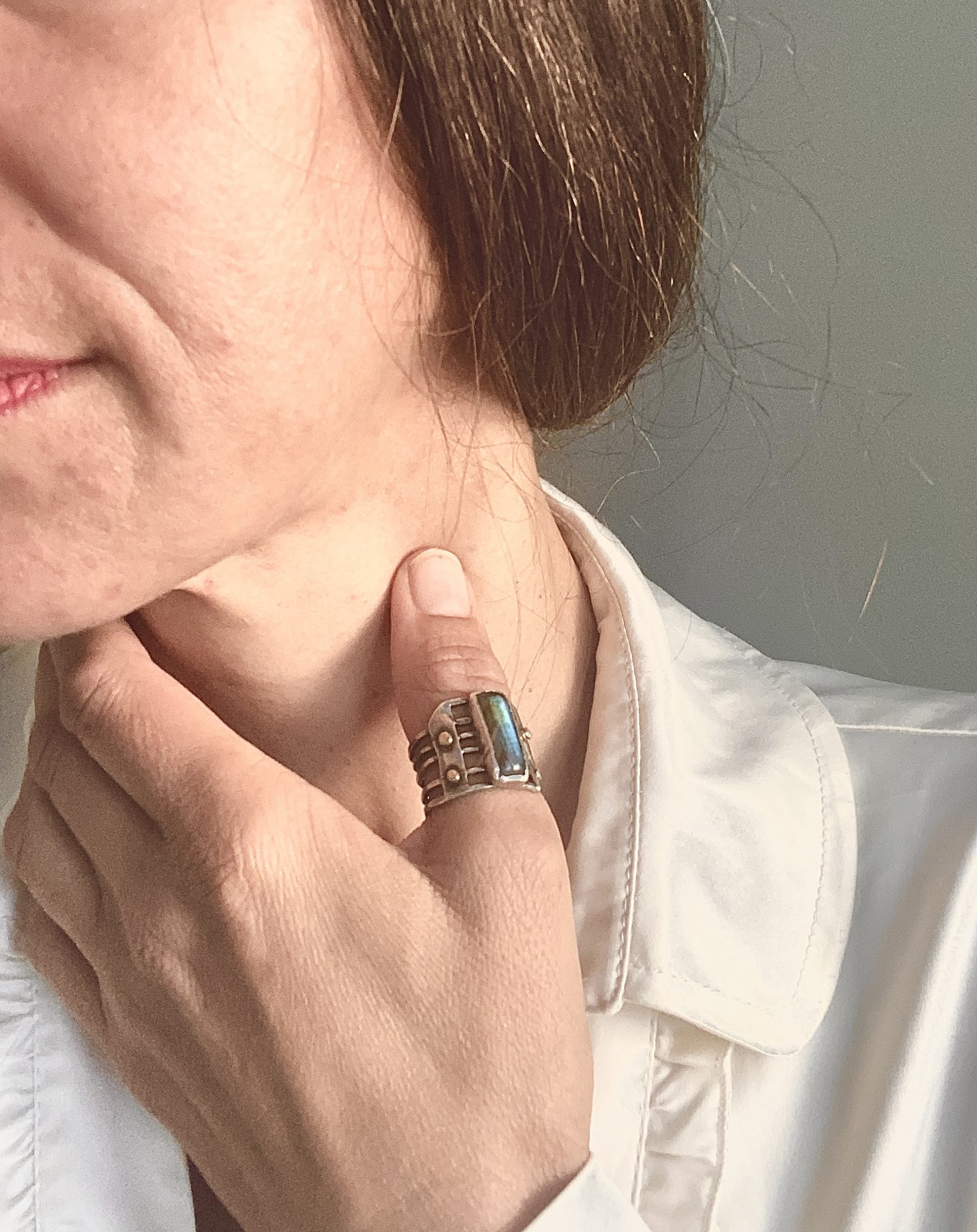Zasveti se Labradorit na ravnih linijah srebra, obdan z zlatimi kapljicami. Eleganten, močan in Prijeten družabnik. Spomnil vas bo na lastno moč in lepoto, ki je v vas ne glede na vse.